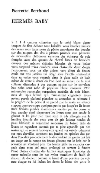 Pierrette Berthoud, già dal nome, nemmeno a vederla, faceva scivolare tutto quel sexe nel testo, ti ricordi che a un certo punto la indicavamo come se fosse il « Berthoud », manco se fosse il podice Marcuzzi, di cui al tuo testo nel secolo dopo, una volta che ti ha patefatto il podice della signorina che poi sarà anche quella della pubblicità di Activia, con tutto quello che si sarebbe ulteriormente accumulato o riversato nel paradigma del nome-archetipo che le avevi cucito addosso ; comunque: il Berthoud, dal nome di persona al nome comune, come analizzò e prescrisse Migliorini negli anni Trenta, che, poi, a pensarci adesso: cosa poteva essere quel Berthoud, un certo tipo di clitoris o un patagonico, per quanto dovesse essere necessariamente ectomorfo, magro cul, tipo quello di Françoise Hardy: